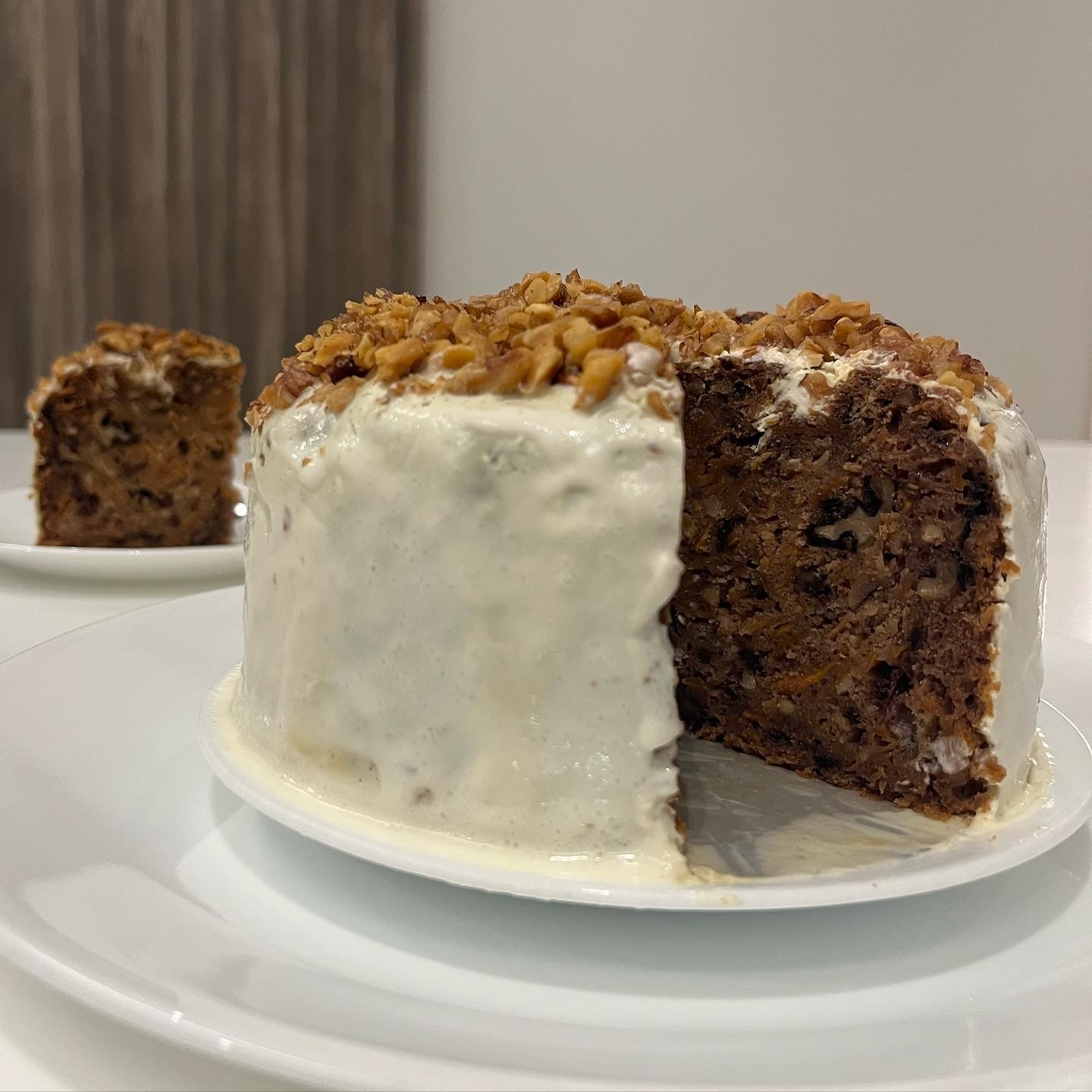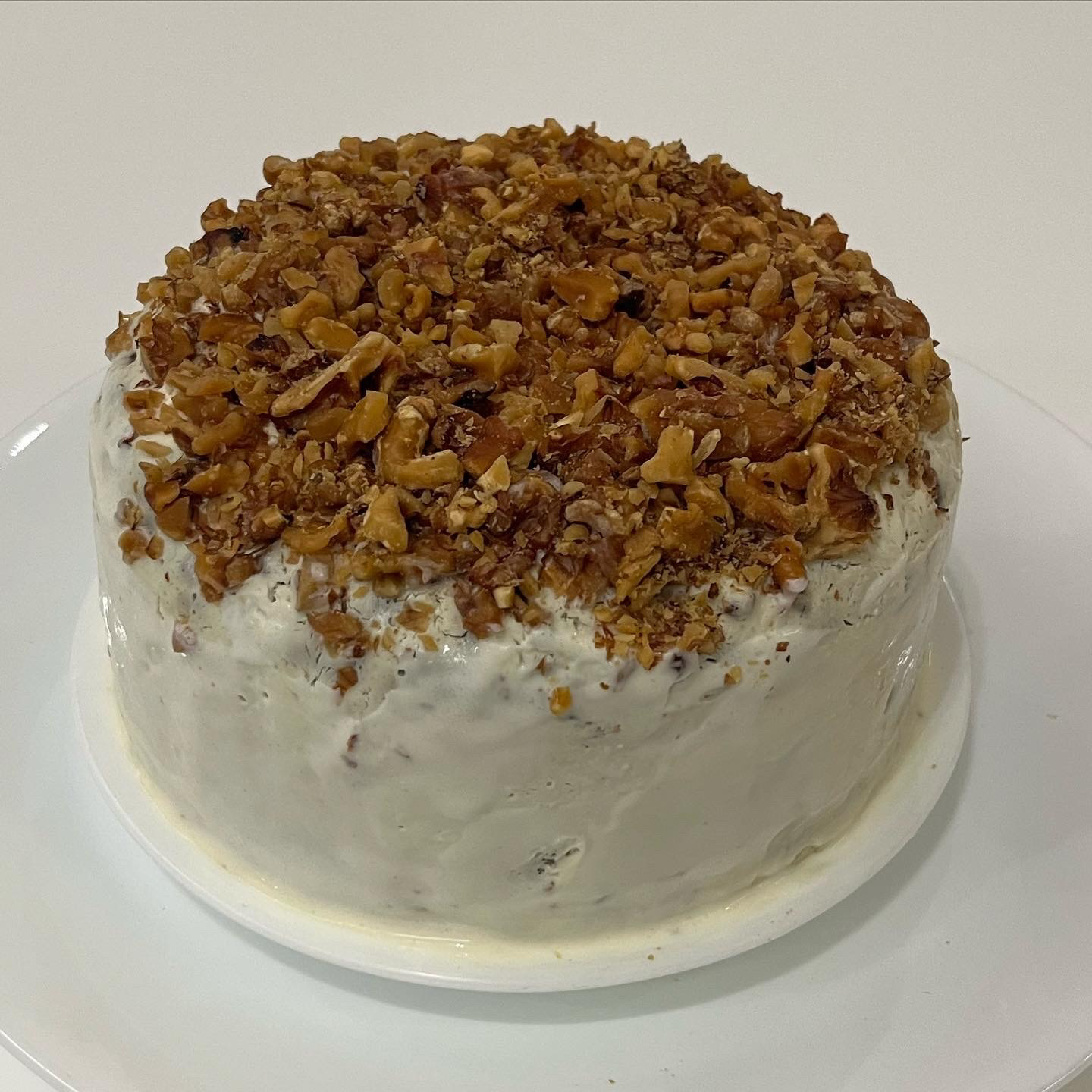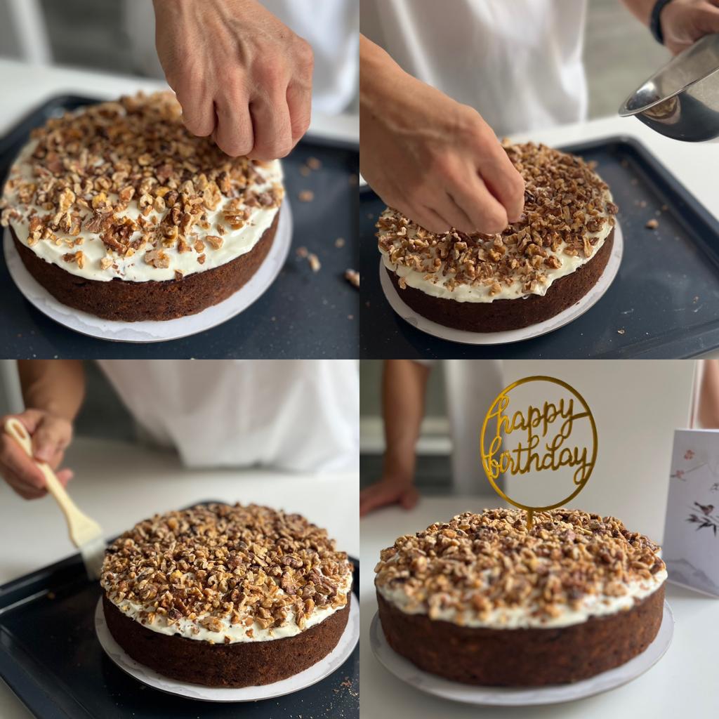 Freshly Baked Carrot Banana Cake topped with chunky Roasted Walnuts and Cream Cheese Frosting. Super moist, natural sweetness from banana. Perfect with a scope of ice cream!